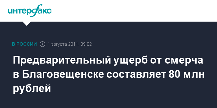 Благовещенск. 1 августа. INTERFAX.RU - Ущерб от смерча, который пронесся над Благовещенском в минувшее воскресенье, по предварительным данным, оценивается в 80 млн рублей, сообщил агентству "Интерфакс-Дальний Восток" пресс-секретарь губернатора Амурской области Антон Ивлев.