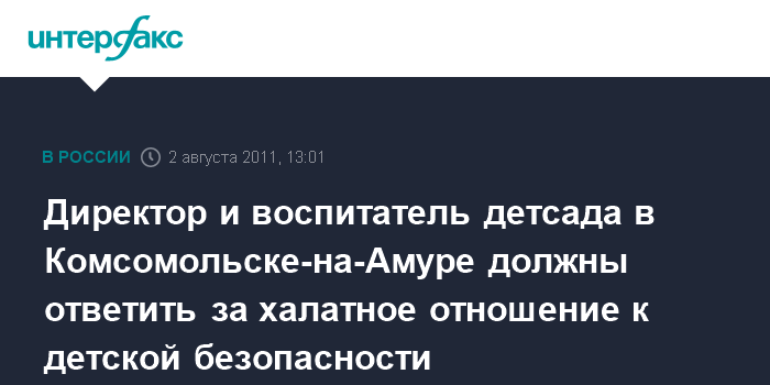 Москва. 2 августа. INTERFAX.RU - Уполномоченный при президенте РФ по правам ребенка Павел Астахов заявил, что за ненадлежащее обеспечение безопасности в детсаду в Комсомольске-на-Амуре должны быть привлечены к ответственности директор учреждения и воспитатель, находившийся с детьми во время взрыва.