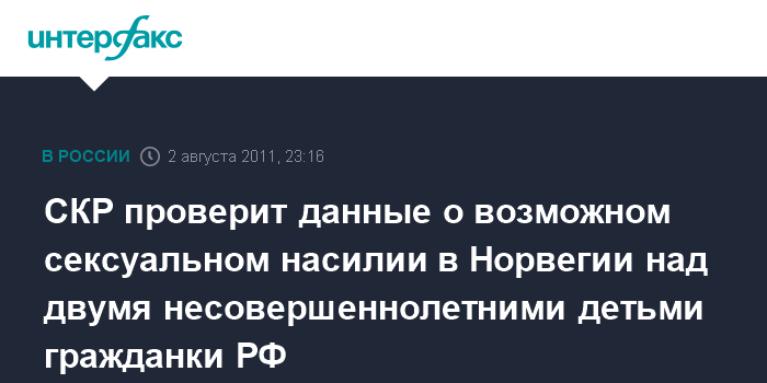 Москва. 2 августа. ИНТЕРФАКС - Председатель СКР Александр Бастрыкин поручил организовать проверку сведений, распространенных в ряде СМИ, о возможно имевшем место быть сексуальном насилии над несовершеннолетними детьми гражданки РФ Ирины Баргсет, проживающей в Норвегии.