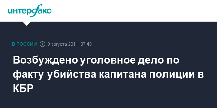 Нальчик. 3 августа. ИНТЕРФАКС-ЮГ - В Кабардино-Балкарии возбуждено уголовное дело по факту убийства капитана полиции, сообщили агентству "Интерфакс-Юг" в Следственном управлении СКР по КБР.