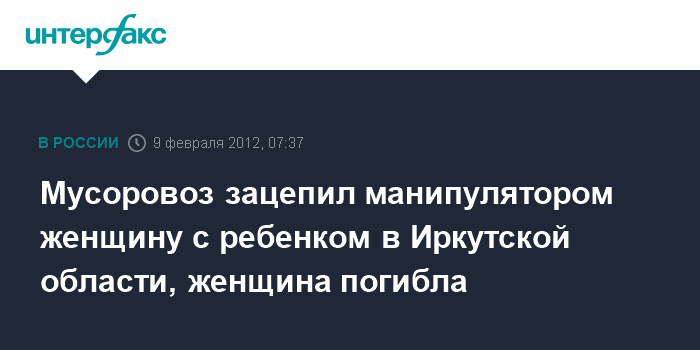 Мусоровоз зацепил манипулятором женщину с ребенком в Иркутской области, женщина погибла