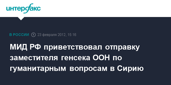 Москва. 23 февраля. INTERFAX.RU - МИД РФ в четверг заявил, что решение о направлении в Сирию заместителя генерального секретаря ООН по гуманитарным вопросам лежит в русле инициативы Москвы.