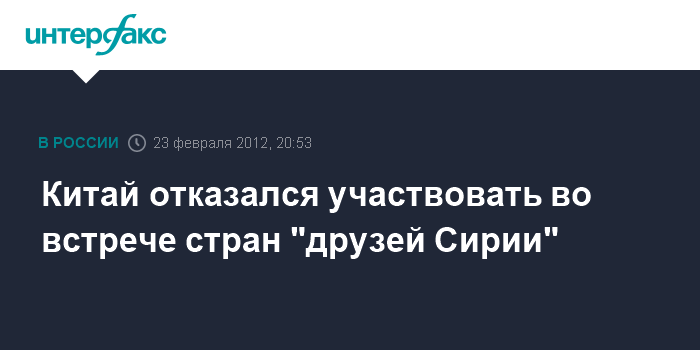 Лондон. 23 февраля. ИНТЕРФАКС - Китай не примет участия в намеченной на пятницу встрече стран "друзей Сирии" в Тунисе, передает британская корпорация Би-Би-Си со ссылкой на МИД КНР.