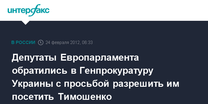 Киев. 24 февраля. ИНТЕРФАКС-УКРАИНА - Депутаты Европарламента, члены комитета парламентского сотрудничества "ЕС-Украина" обратились в Генеральную прокуратуру Украины с просьбой разрешить им встретиться с бывшим премьер-министром Юлией Тимошенко.
