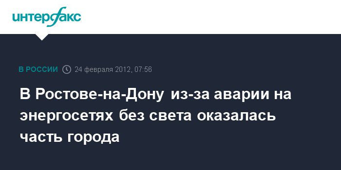 Ростов-на-Дону. 24 февраля. INTERFAX.RU - Из-за аварии в энергосетях без энергоснабжения оказались несколько улиц в одном из густонаселенных жилых массивов Ростова-на-Дону, также отключены порядка пяти котельных, сообщили "Интерфаксу" в экстренных службах города.