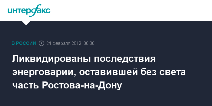 Ростов-на-Дону. 24 февраля. INTERFX.RU - Аварийные бригады энергетиков в короткие сроки устранили неполадки на одном из участков электросетей в Ростове-на-Дону, сообщили в пятницу агентству "Интерфакс-Юг" в пресс-службе "Ростовэнерго".