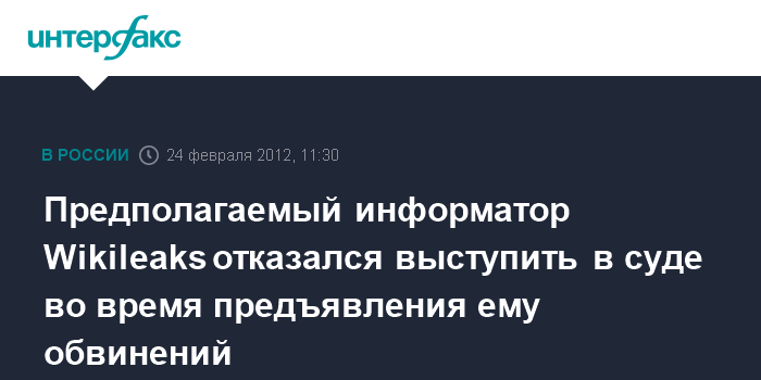 Вашингтон. 24 февраля. INTERFAX.RU - Подозреваемый в передаче секретной информации веб-сайту Wikileaks военнослужащий США Брэдли Мэннинг отказался выступить в военном суде во время процедуры предъявления ему официальных обвинений, сообщают в пятницу американские СМИ.