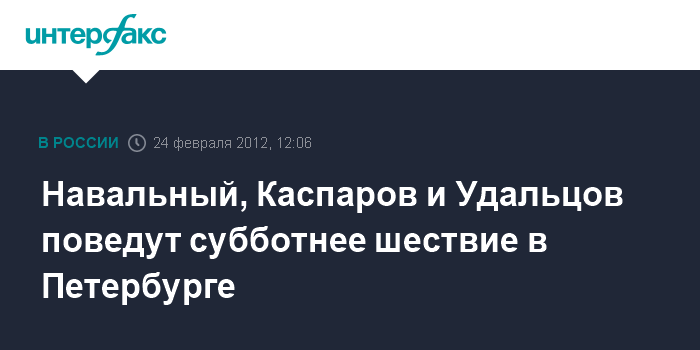 Санкт-Петербург. 24 февраля. INTERFAX.RU - Шествие "За честные выборы" в Петербурге в субботу возглавят Алексей Навальный, Гарри Каспаров и Сергей Удальцов, сообщил "Интерфаксу" лидер городского отделения "Другой России" Андрей Дмитриев.