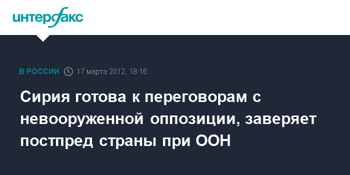 Нью-Йорк (ООН). 17 марта. INTERFAX.RU - Постоянный представитель Сирии при ООН Башар Джаафари в интервью телеканалу RT на арабском языке - "Русия аль-Яум" заверил, что в Дамаске готовы к переговорам с оппозиционерами, не оказывающими вооруженного сопротивления властям.