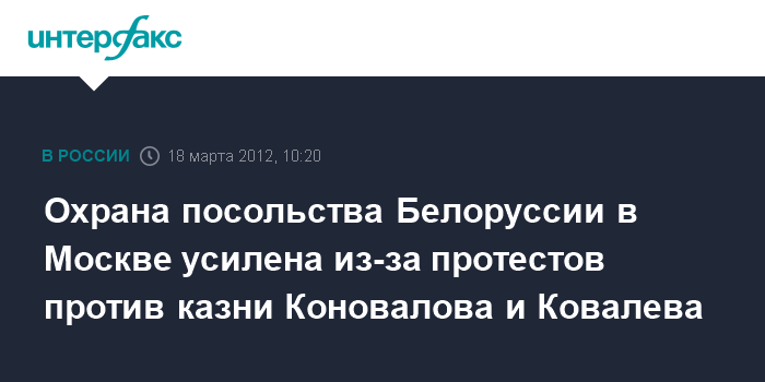 Москва. 18 марта. INTERFAX.RU - Около посольства Белоруссии в Москве в воскресенье предприняты повышенные меры безопасности в связи с ожидаемыми акциями протеста против казни осужденных за теракт в минском метро.