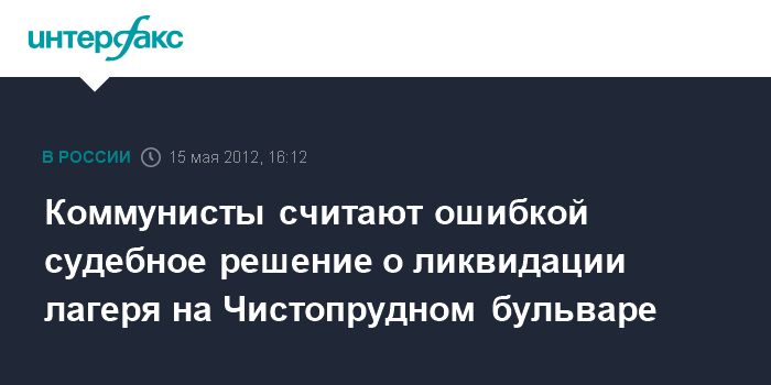 Москва. 15 мая. INTERFAX.RU - Депутаты Госдумы от КПРФ негативно отреагировали на решение суда о ликвидации лагеря оппозиции на Чистых прудах в Москве.