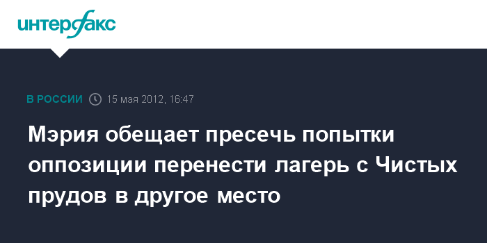 Москва. 15 мая. INTERFAX.RU - Оппозиционеры, обосновавшиеся на Чистопрудном бульваре, в случае попытки организовать лагерь в другом месте Москвы должны быть готовы к адекватной реакции правоохранительных органов, заявил "Интерфаксу" руководитель департамента региональной безопасности Москвы Алексей Майоров.