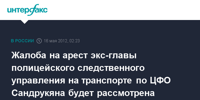 Москва. 16 мая. ИНТЕРФАКС - Мосгорсуд в среду рассмотрит жалобу адвокатов на арест бывшего начальника Следственного управления на транспорте по Центральному федеральному округу МВД РФ Эдуарда Сандрукяна, которого подозревают в мошенничестве.