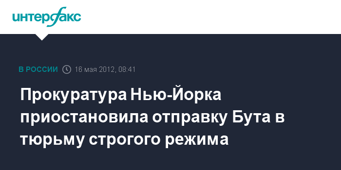 Лондон. 16 мая. INTERFAX.RU - Прокуратура Нью-Йорка приостановила перевод россиянина Виктора Бута из места предварительного наказания в супертюрьму в городе Флоренс, штат Колорадо, известную среди журналистов как Алькатрас Скалистых гор, передала телерадиокорпорация BBC.