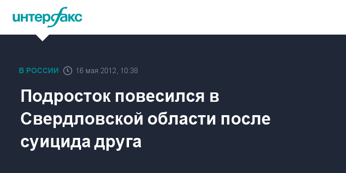 Екатеринбург. 16 мая. INTERFAX.RU - Подросток повесился в городе Новоуральск Свердловской области после похорон своего друга, который также покончил жизнь самоубийством, сообщил агентству "Интерфакс-Урал" старший помощник руководителя регионального СУ СКР по взаимодействию со СМИ Александр Шульга.