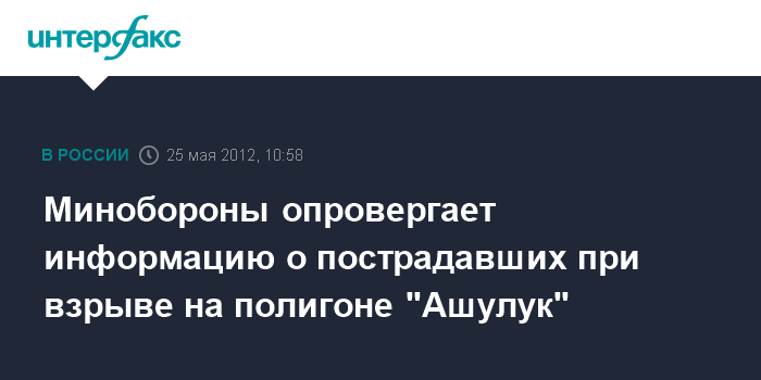 Москва. 25 мая. INTERFAX.RU - При взрыве боеприпасов на площадке утилизации полигона "Ашулук" в Астраханской области никто не пострадал, сообщил "Интерфаксу-АВН" в пятницу начальник пресс-службы Западного военного округа (ЗВО), полковник Андрей Бобрун.