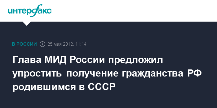 Москва. 25 мая. INTERFAX.RU - Глава МИД РФ Сергей Лавров считает, что надо серьезно упростить процедуру предоставления российского гражданства тем, кто родился в СССР.