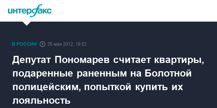 Москва. 25 мая. INTERFAX.RU - Депутат-эсер Илья Пономарев подверг критике решение о выдаче квартир сотрудникам полиции, пострадавшим 6 мая во время акции оппозиции на Болотной площади в Москве.