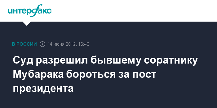 Каир. 14 июня. INTERFAX.RU - Конституционный суд Египта в четверг разрешил бывшему соратнику Хосни Мубарака Ахмаду Шафику продолжить борьбу за пост президента страны, сообщает местное телевидение.