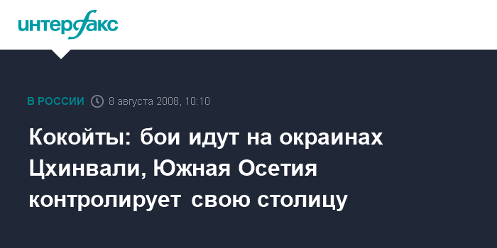 "Мы полностью контролируем свою столицу. Бои идут на окраинах Цхинвали", - заявил Эдуард Кокойты "Интерфаксу" по телефону. "Ситуация абсолютно контролируема. Мы находимся рядом", - сказал также по телефону "Интерфаксу" президент Северной Осетии Теймураз Мамсуров.