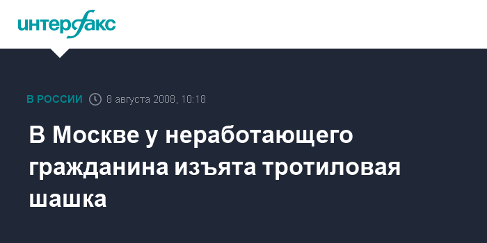 Москва. 8 августа. INTERFAX.RU - На севере Москвы задержан неработающий 38-летний мужчина, у которого была обнаружена и изъята 100-граммовая тротиловая шашка, сообщил "Интерфаксу" в пятницу источник в правоохранительных органах.