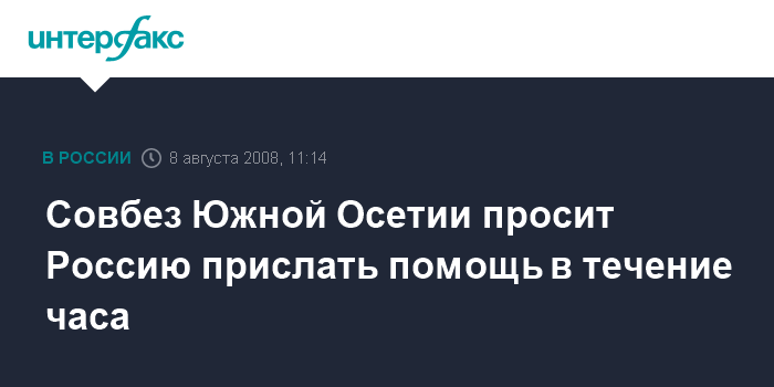 Москва. 8 августа. INTERFAX.RU - Совбез Южной Осетии обратился к руководству России с призывом в течение часа прислать помощь, чтобы избежать большого количества жертв.