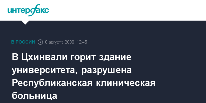 Москва. 8 августа. INTERFAX.RU - В Цхинвали горит здание университета, расположенное примерно в 500 метрах от штаба миротворческих сил, передает в пятницу корреспондент агентства "Интерфакс". Также разрушена Республиканская клиническая больница.