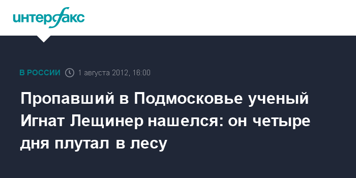 Москва. 1 августа. INTERFAX.RU - Пропавший четверо суток назад в Подмосковье 28-летний научный сотрудник Гарвардского университета США Игнат Лещинер найден живым и здоровым, он заблудился, сообщила официальный представитель областного управления СКР Ирина Гуменная.