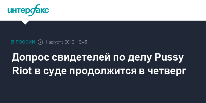 Москва. 1 августа. INTERFAX.RU - Хамовнический суд Москвы продолжит допрос свидетелей со стороны обвинения по делу Pussy Riot 2 августа.