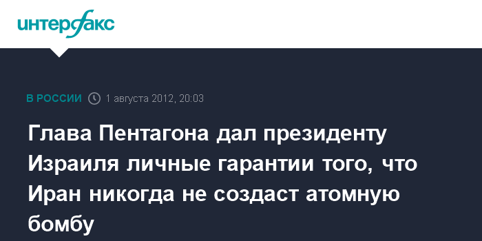 Иерусалим. 1 августа. INTERFAX.RU - Министр обороны США Леон Панетта лично гарантировал президенту Израиля Шимону Пересу, что Иран никогда не создаст атомную бомбу, сообщает в среду агентство ЭФЭ.