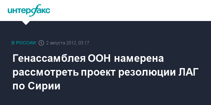 Нью-Йорк (ООН). 2 августа. ИНТЕРФАКС - Генеральная ассамблея ООН, как ожидается, рассмотрит в четверг проект резолюции Лиги арабских государств (ЛАГ), призывающей к ведению санкций в отношении Сирии, сообщают дипломатические источники в штаб-квартире Всемирной организации.