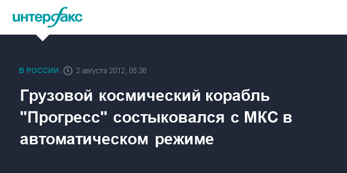 Королев (Московская область). 2 августа. ИНТЕРФАКС-АВН - Стартовавший накануне вечером с Байконура грузовой космический корабль "Прогресс М-16М" успешно состыковался с Международной космической станцией (МКС), передает в четверг корреспондент "Интерфакса-АВН" из подмосковного Центра управления полетами (ЦУП).