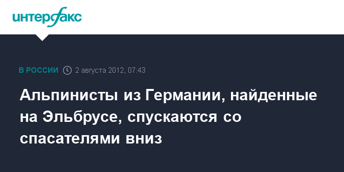 "Пропавших вечером 1 августа двух альпинистов из Германии в 23:35 мск нашли на восточной вершине Эльбруса. Спустились на ночлег на седловину и утром в 7:00 начали спуск в базовый лагерь", - сказал К.Давыдов.