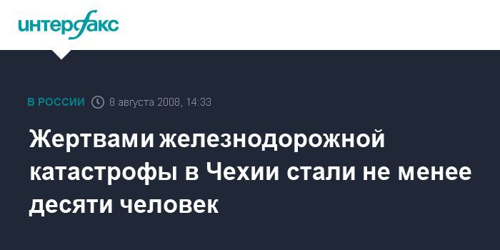 Москва. 8 августа. INTERFAX.RU - Не менее десять человек погибли, еще около ста получили ранения и травмы в пятницу в результате железнодорожной катастрофы в Чехии, сообщает чешский телеканал ЧТ24.