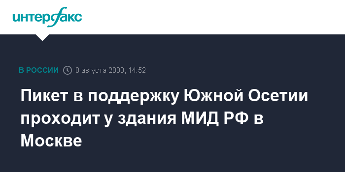 Москва. 8 августа. INTERFAX.RU - Перед зданием МИД РФ в Москве в пятницу днем развернут пикет в поддержку Южной Осетии.