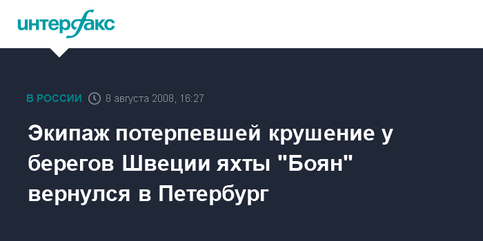 Москва. 8 августа. INTERFAX.RU - В Петербург в пятницу вернулся экипаж потерпевшей крушение у берегов Швеции яхты "Боян", сообщили "Интерфаксу" в городском парусном союзе.