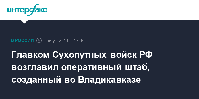 Москва. 8 августа. INTERFAX.RU - Главком Сухопутных войск РФ генерал армии Владимир Болдырев возглавил оперативный штаб, созданный во Владикавказе в связи с событиями в Южной Осетии.
