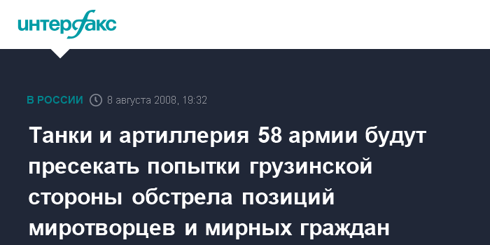 "Грузинские войска, вошедшие в Южную Осетию, находятся в зоне поражения огневых средств подразделений 58-й армии. В дальнейшем любая стрельба в зоне ответственности российских миротворцев будет жестко пресекаться", - заявил помощник главкома Сухопутных войск.