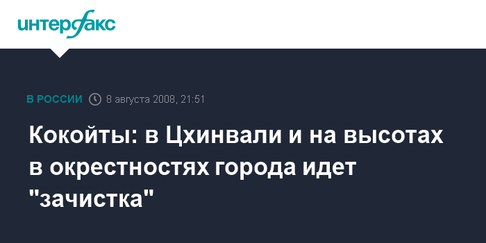 Москва. 8 августа. INTERFAX.RU - Президент Южной Осетии Эдуард Кокойты сообщил в пятницу вечером "Интерфаксу", что "в настоящее время идет зачистка Цхинвали". "Также идет работа на прилегающих к городу высотах", - отметил югоосетинский лидер.