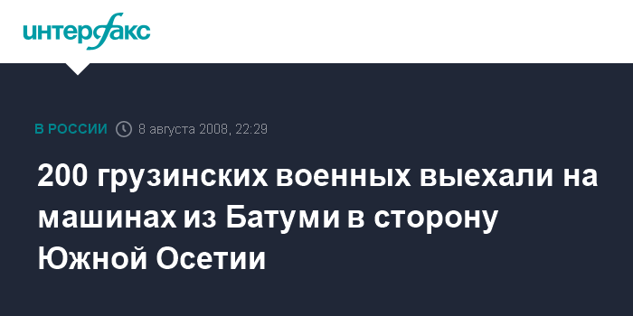 Москва. 8 августа. INTERFAX.RU - Колонна примерно из 20 военных грузовиков в пятницу около 22:00 по московскому времени вышла из Батуми в направлении Южной Осетии, сообщили "Интерфаксу" очевидцы с места событий. По их данным, в каждой машине примерно по 10 вооруженных солдат, в общей сложности в колонне следуют около 200 человек. Колонну сопровождает дорожная полиция.