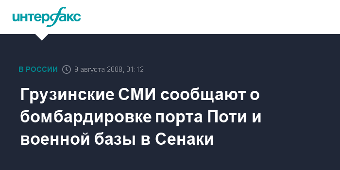 Москва. 9 августа. INTERFAX.RU - Российские военные самолеты вечером в пятницу нанесли бомбовый удар по порту Поти и военной базе Минобороны Грузии в Сенаки, сообщила грузинская телекомпания "Рустави-2". "Интерфакс" не располагает подтверждением этой информации со стороны российских военных.
