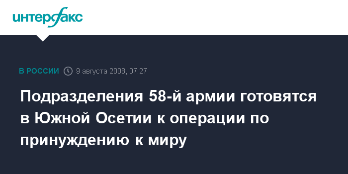 Москва. 9 августа. INTERFAX.RU - Подразделения 58-й российской армии, прибывшие в Цхинвали на помощь российским миротворцам, приступили к подготовке операции по принуждению к миру, сообщил "Интерфаксу" помощник главкома Сухопутных войск РФ Игорь Конашенков.