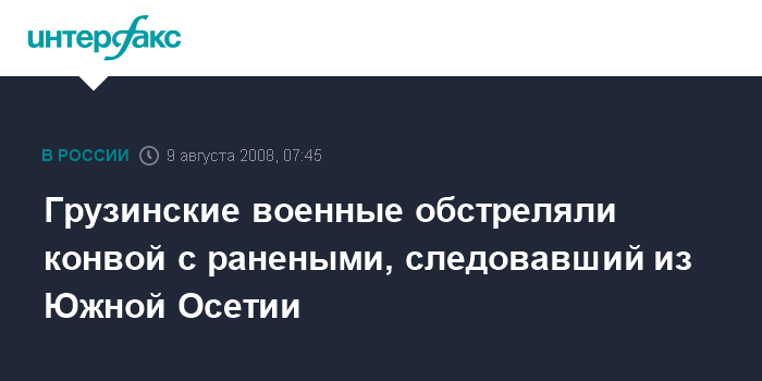 Москва. 9 августа. INTERFAX.RU - Конвой с ранеными, следовавший из Южной Осетии в Россию, был обстрелян грузинскими вооруженными силами, сообщил "Интерфаксу" помощник главкома Сухопутных войск РФ Игорь Конашенков.