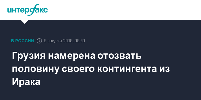 Москва. 9 августа. INTERFAX.RU - Грузия намерена отозвать половину своего контингента из Ирака в связи с ситуацией в Южной Осетии, передает телеканал "Вести".