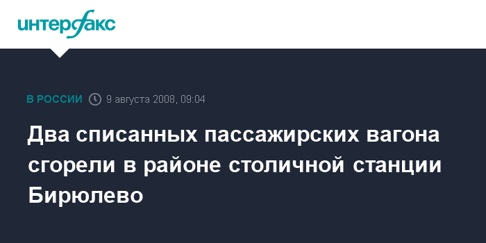 Москва. 9 августа. INTERFAX.RU - Два списанных пассажирских вагона Московской железной дороги сгорели в отстойнике в районе станции Бирюлево.