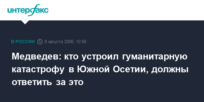 Москва. 9 августа. INTERFAX.RU - Президент РФ Дмитрий Медведев заявил, что лица, ответственные за гуманитарную катастрофу в Южной Осетии, должны понести за это ответственность, в том числе с применением международно-правовых норм.