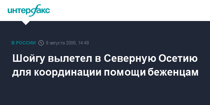 Как сообщила "Интерфаксу" начальник управления информации МЧС России Ирина Андрианова, Шойгу вылетел в Северную Осетию для руководства и координации деятельности по оказанию помощи беженцам из Южной Осетии, их размещению, организации медицинской помощи, питания.