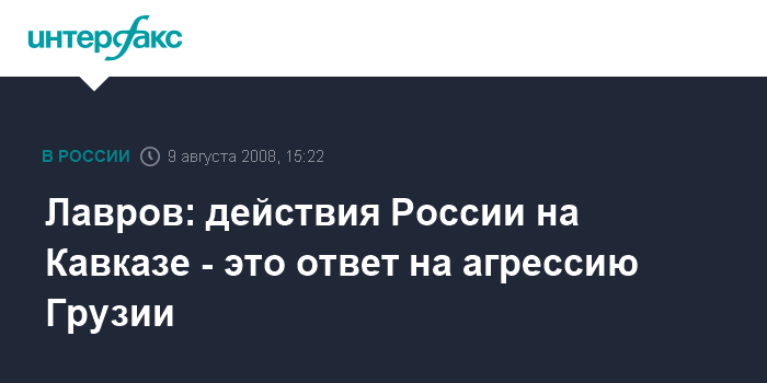 "Поскольку уже второй день грузинские силы вовлечены в агрессивные действия, полностью нарушая международные соглашения и международные гуманитарные законы, ведя атаки на гражданских лиц, на жилые дома, конвой, который вывозит раненых из района сражений, а по некоторым сообщениям, и добивая их, это стало неприемлемо для нас. Ответственность России как миротворца сводится к реакции на эту агрессию", - сказал Лавров.
