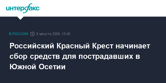 Москва. 9 августа. INTERFAX.RU - Российский Красный Крест (РКК) объявляет сбор средств для приобретения медицинского оборудования, одежды, обуви, постельных принадлежностей и детского питания для пострадавших в результате боев в Южной Осетии.