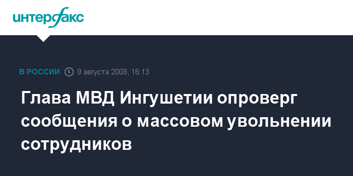 Москва. 9 августа. INTERFAX.RU - Информация о том, что в связи с оперативной обстановкой в Ингушетии сотрудники милиции увольняются из органов внутренних дел не соответствуют действительности, заявил в субботу на рабочем совещании в аппарате МВД Ингушетии глава МВД Мусса Медов.